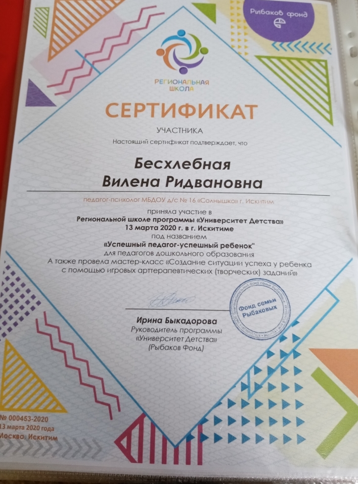 Сертификат участника. Приняла участие в Региональной школе программы "Университет Детства" под названием "Успешный педагог-успешный ребенок"13 марта 2020г.